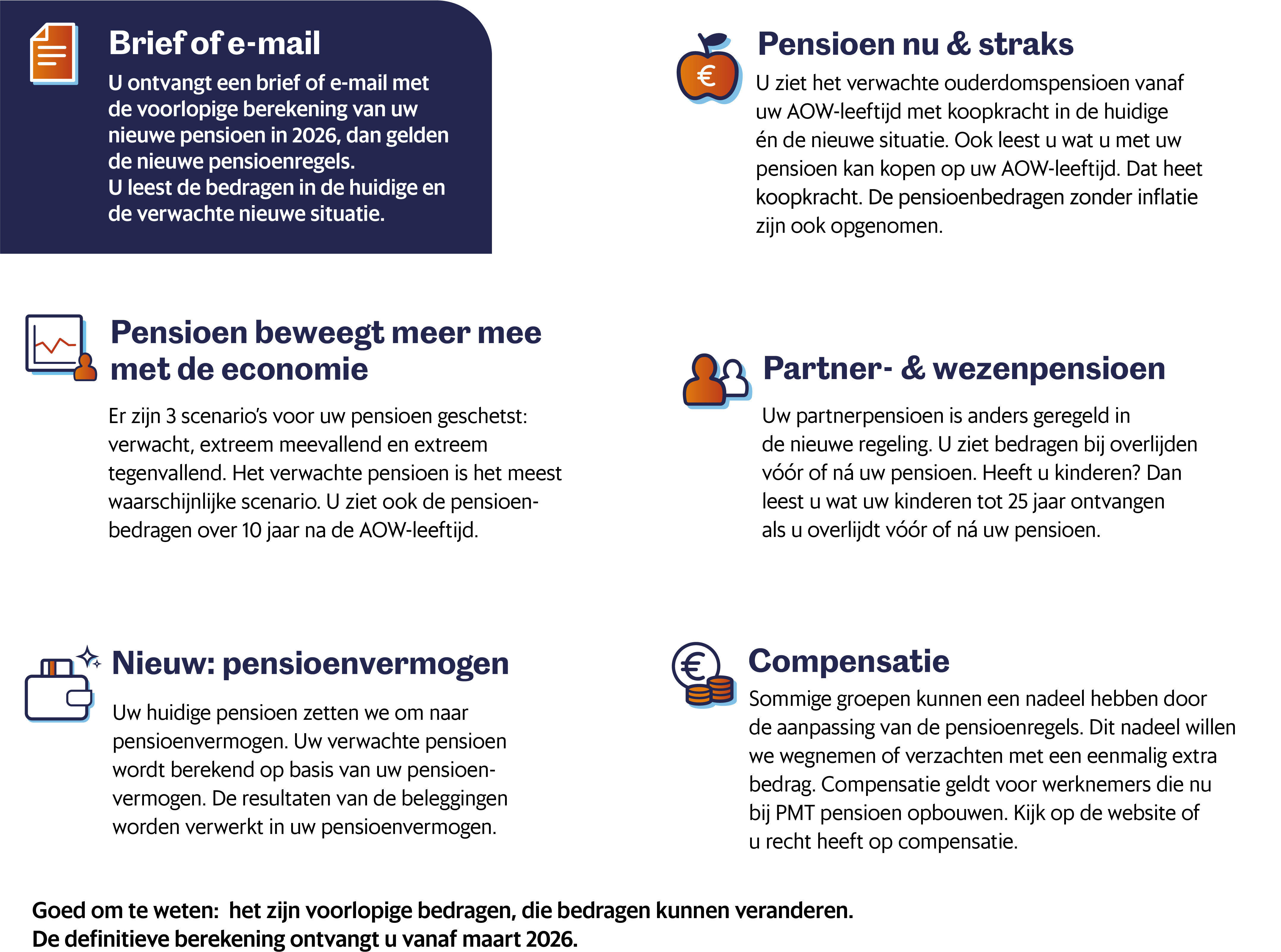 De belangrijkste informatie uit de brief hebben we samengevat in deze infographic: De voorlopige berekening van uw pensioen. Dit geeft u overzicht! Alle persoonlijke bedragen ziet u terug in uw brief.