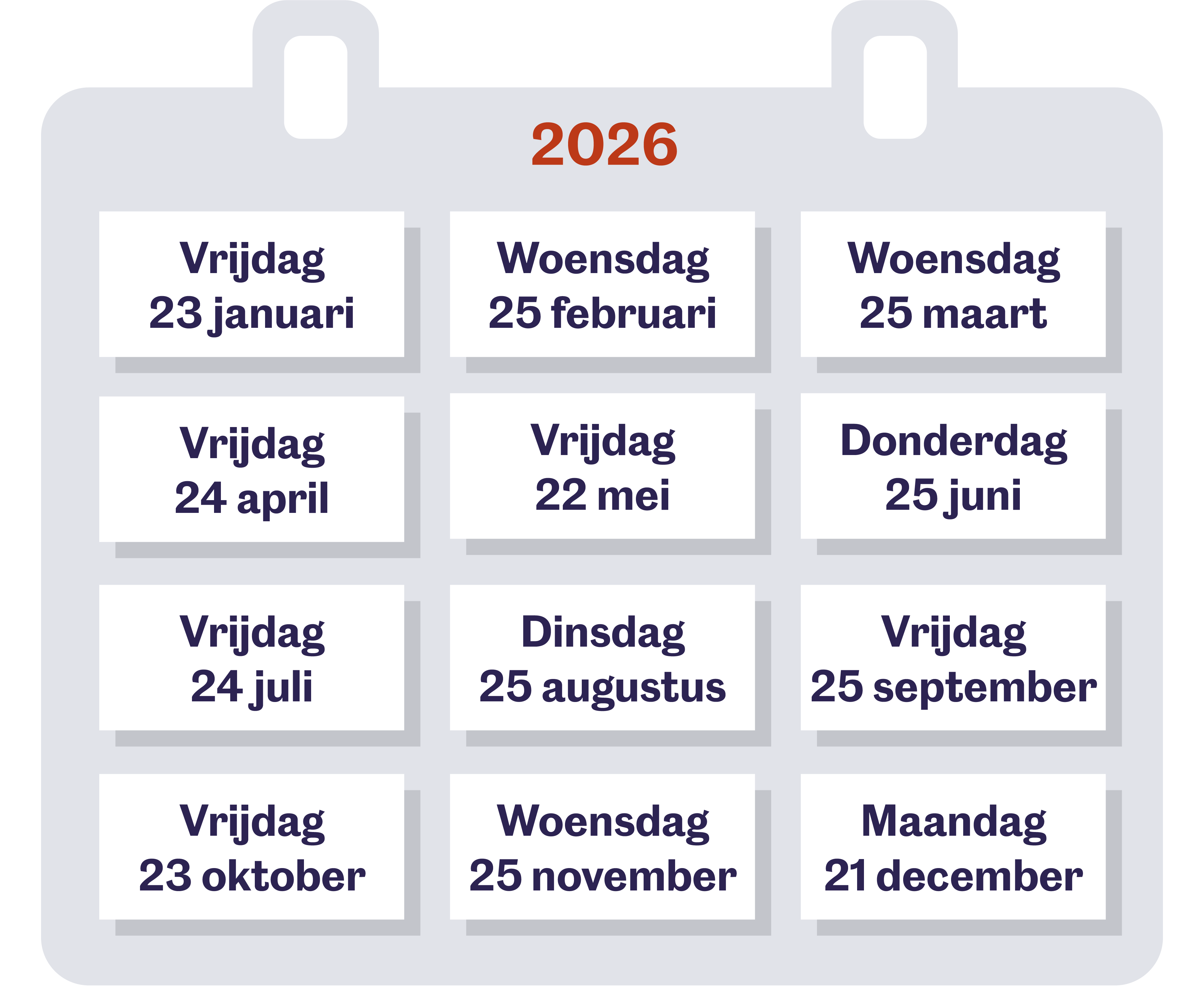 Wanneer maken we uw pensioen over in 2026? Zet de data alvast in uw agenda. Het verschilt per bank of uw pensioen dezelfde dag, of een dag later, op uw rekening staat.