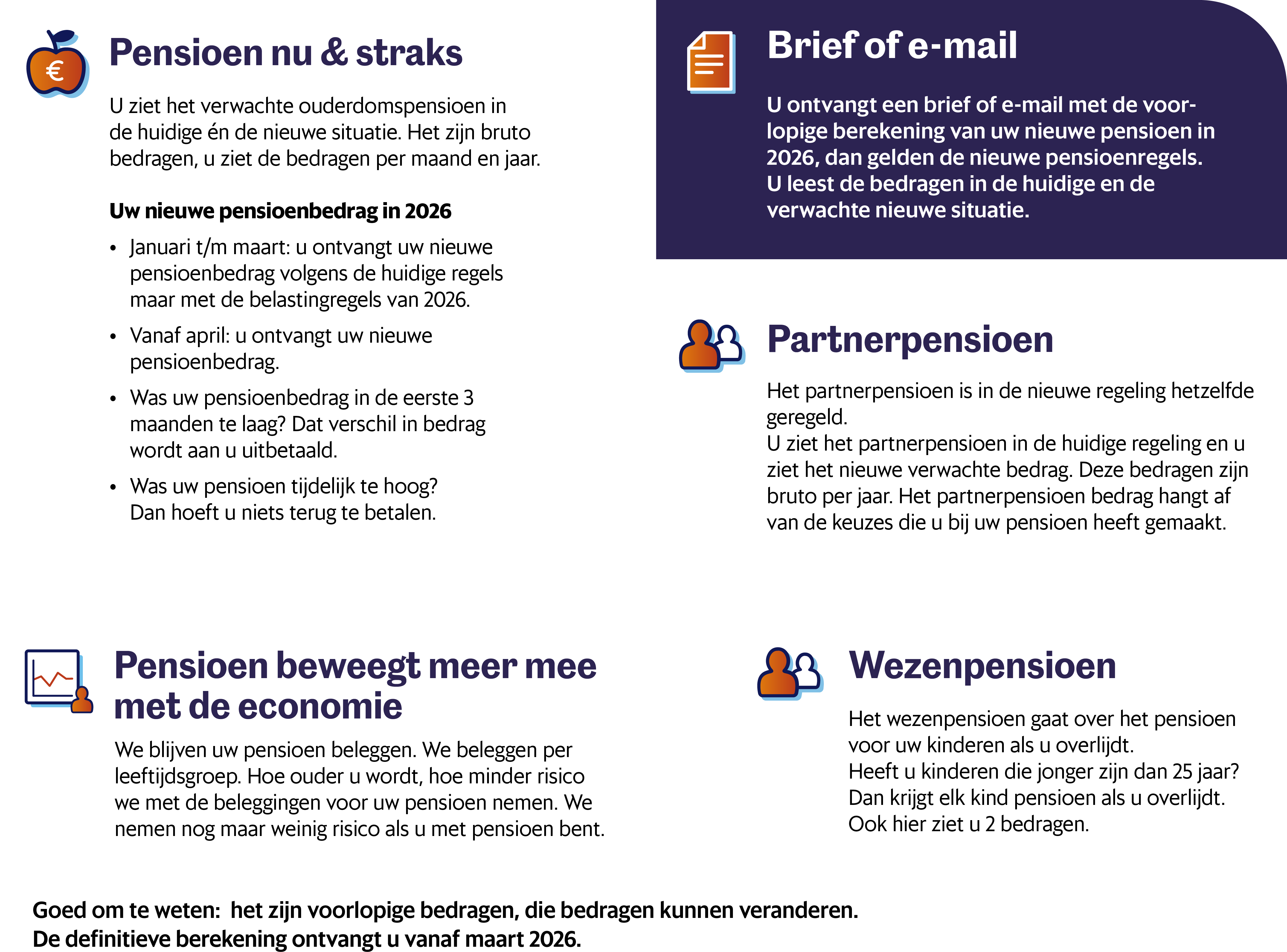 De belangrijkste informatie uit de brief hebben we samengevat in deze infographic: De voorlopige berekening van uw pensioen. Dit geeft u overzicht! Alle persoonlijke bedragen ziet u terug in uw brief. Ook hoe het geregeld is met uw pensioen in de eerste maanden van 2026.